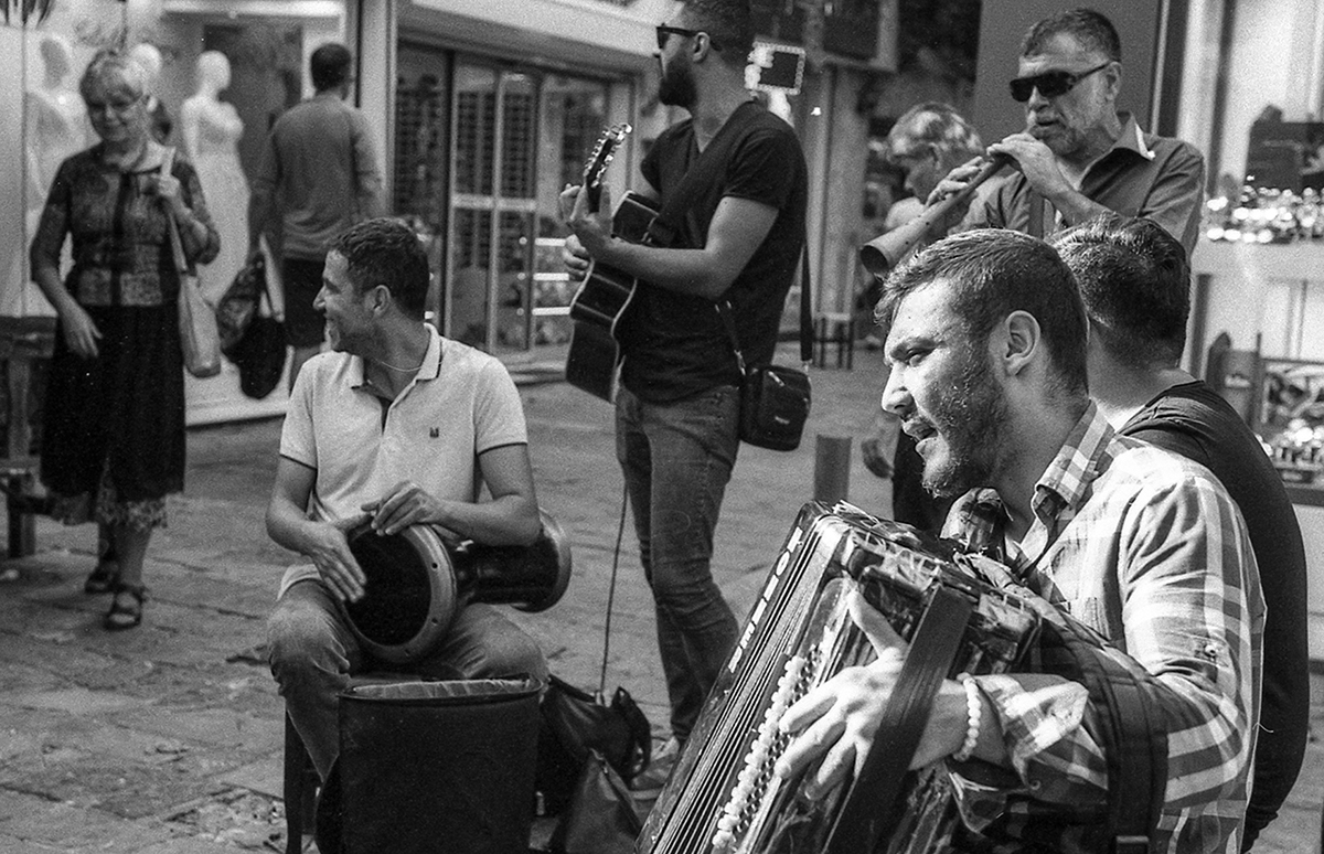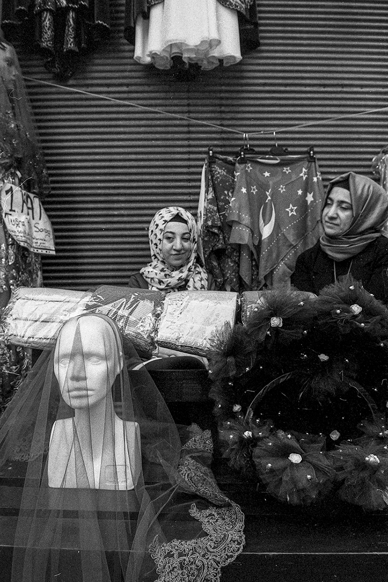 İkinci fotoğraf da dördüncü fotoğrafa benzer bir hikaye var. İlgimi tül örtülmüş manken kafası çekmişti. Bunun hemen solunda oturan bir adam vardı. Ancak kompozisyon hoşuma gitmedi ve çekmek için çaba sarf etmedim. Bir süre sonra dönerken bu sefer arkada olan iki kız gelmiş oturmuştu. Önce onlarla uzun bir süre bakışıp eşitlendik. İzin istedim. Ve fotoğrafı çektim.