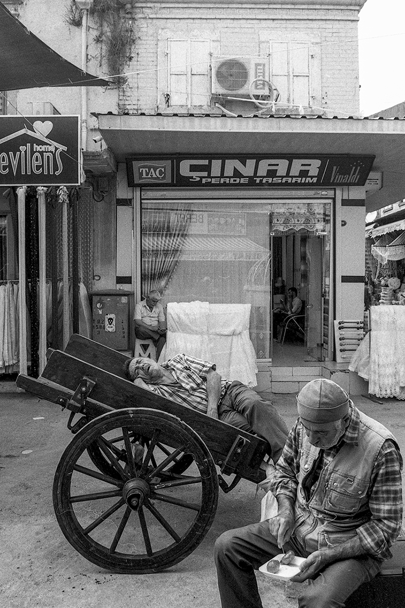 Üçüncü fotoğraf, Arabada uyuyan kişi yaklaşık 45 yıl önce Konya’dan göç etmiş. Ve manifaturacıların yoğun olduğu Kemeraltı bölgesinde kasabalardan gelen esnafın aldığı top top kumaşların taşımasını yapar. Bugüne kadar iş yaparken görmedim. Kalender birisidir. İyi portre fotoğrafı verir.