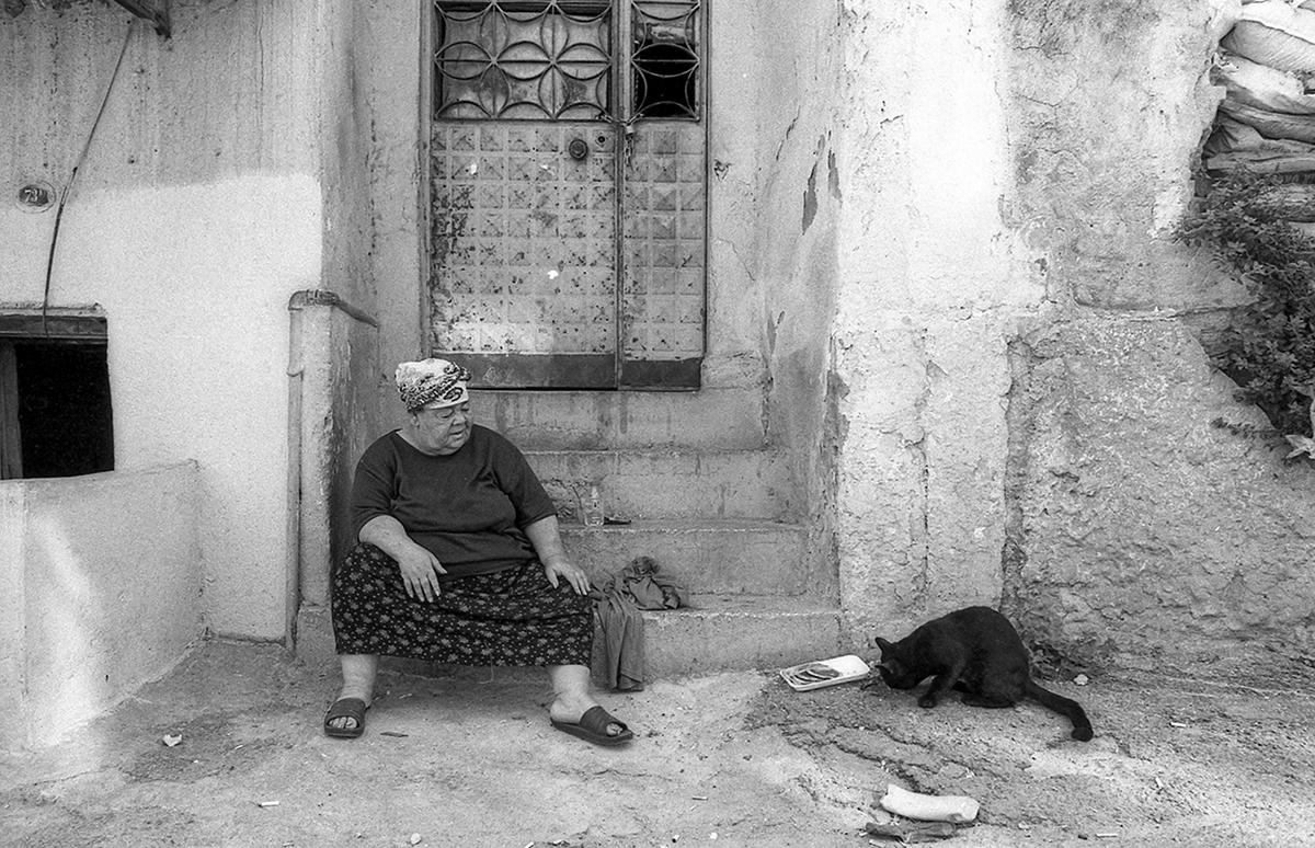 Dördüncü fotoğraf Basmane'nin göbeğidir. Basın müzesine yürürken kadın orada oturuyordu ve yanındaki tabakta küçük pideler duruyordu. Fotoğraf olarak bir değeri yoktu. Aynı yoldan dönerken bu sefer kadın pideleri kediye vermiş seyrediyordu. Sohbet edip fotoğrafı çektim.