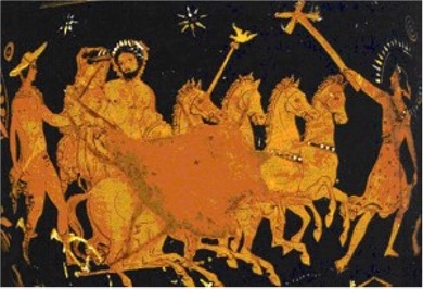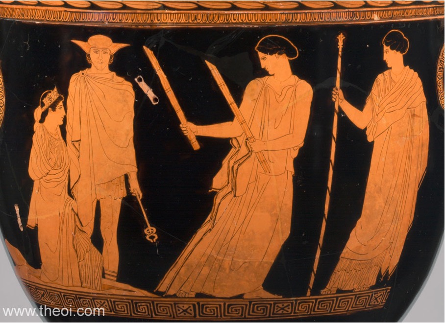 Hades, bir quadriga arabasını sürerek Persephone’yi Hermes ve Hekate eşliğinde üst dünyaya geri döndürür. Tanrılar niteliklerine göre tanımlanırlar – Hades kuş uçlu bir asa, Hekate dört başlı bir Eleusis meşalesi ve halesi taşır ve Hermes bir haberci asası, kanatlı çizmeler ve petasos şapkası taşır., British Museum, Londra. Katalog No: London F277