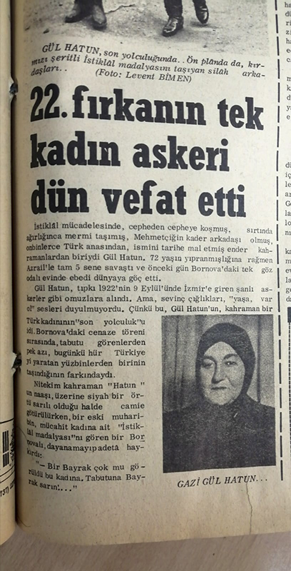 Murat Gültekin’in önerisiyle Milli Kütüphane arşivinde 17 Şubat tarihli gazeteleri incelemeye karar verdim. Arşivde Şubat 1968’in ciltlenmiş yeni asır gazetelerini taramaya başladım. 20 Şubat tarihli gazetenin birinci sayfasında cenaze töreniyle ilgili yapılan haberi gördüğümde dünyalar benim olmuştu. “22. fırkanın tek kadın askeri dün vefat etti” yazıyordu haberin başlığında. Kuvayı Milliye gazi elbisesi giymiş üniformalı iki gaziden biri elinde gül hanımın istiklal madalyasını taşıyordu. Haberi Levent Bimen yapmıştı.