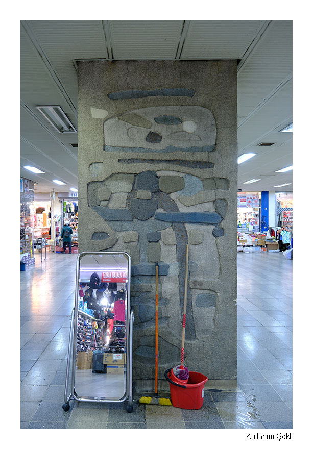 Çarşıya girdiğinizde ilk göze çarpan rölyefin (Atilla GALATALI),  yandaki mağazanın ayakkabı kutuları ve reklam tabelası ile bir parçasının kapatıldığı… Katları gezmeye başladığınızda da kimi rölyefin önündeki mağazaya ait elbise askılıklarıyla, kimi resimlerin iş yerlerinin süpürüldüğü ıslak paspasların dayanmasıyla bozulduğu ve  kapatıldığı…  Kimi seramik panolar ve resimler de  boş kutular ve tezgahlarla kapatılmış durumdalar.