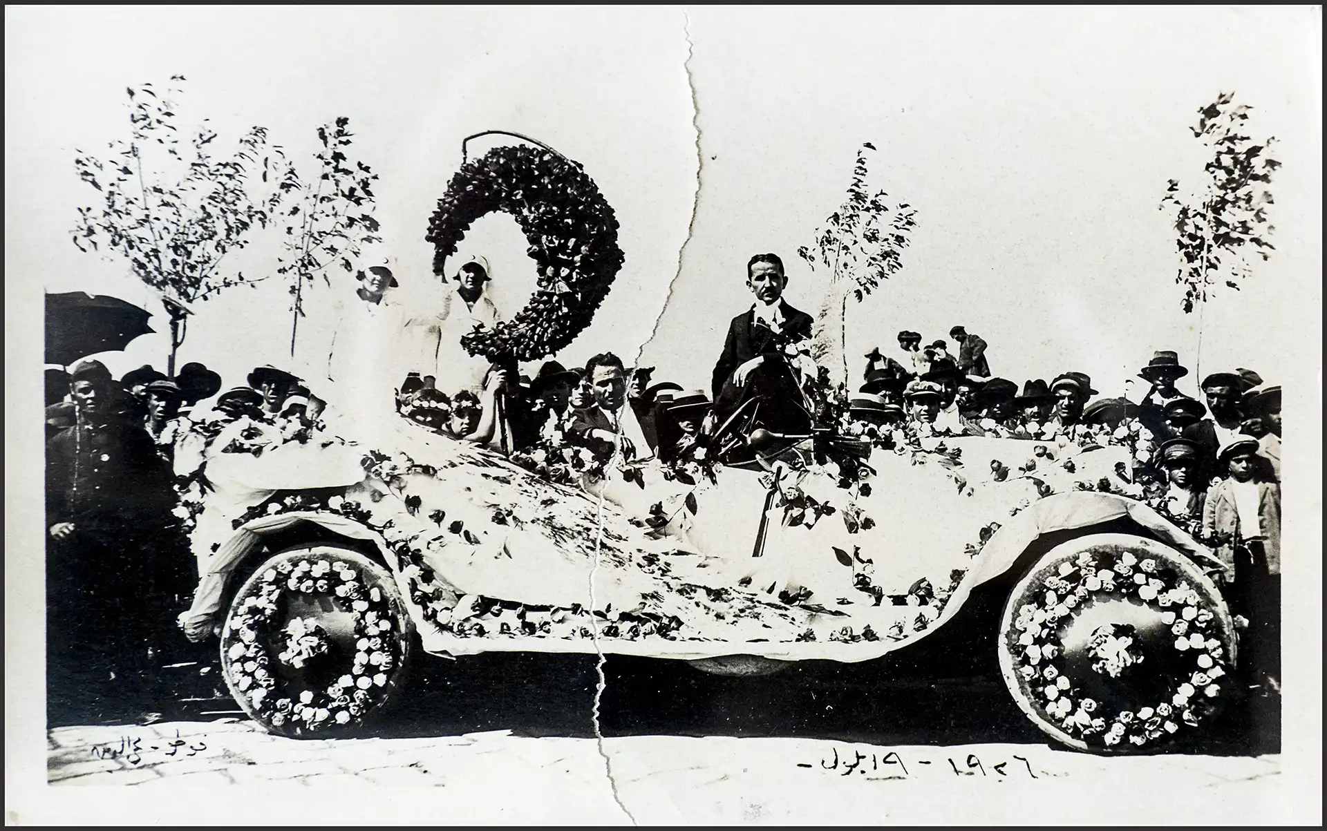 Şu arabanın süslerine bakın; yine çiçeklerle kaplanmış bir Kızılay simgesi ile o zamanın hemşire kepleri ile iki kız seçilmektedir.