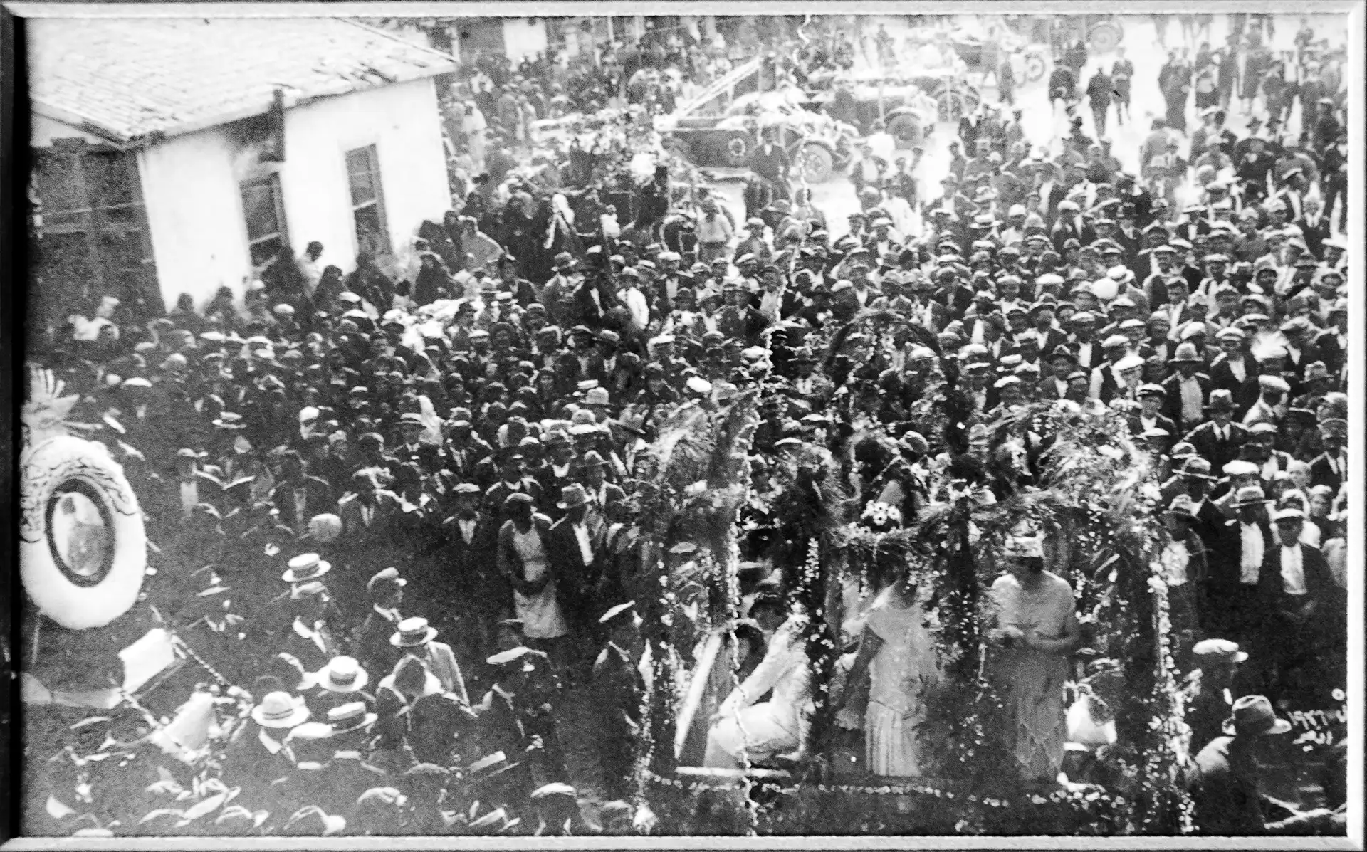 Çok büyük kalabalık olurmuş kutlamalarda. Sol kenarda Atatürk portreli bir çelek görüyoruz. Şimdilerde o ev kalmamıştır. En arkada yine süslenmiş bir dizi araba yer alıyor. Meydanlık gibi bir yer. Önde de kamyon ya da at arabası kasasında bir grup kadın özel giysiler içinde kortejdeki yerini almış. Neyi simgeledikleri ve hangi alanda çekildiği anlaşılmıyor. Keşke fotoğrafların sahibi bunları yırtıp çöpe atılmış olmasına neden olacağına daha net yazılarlar meraklı birine verseydi.