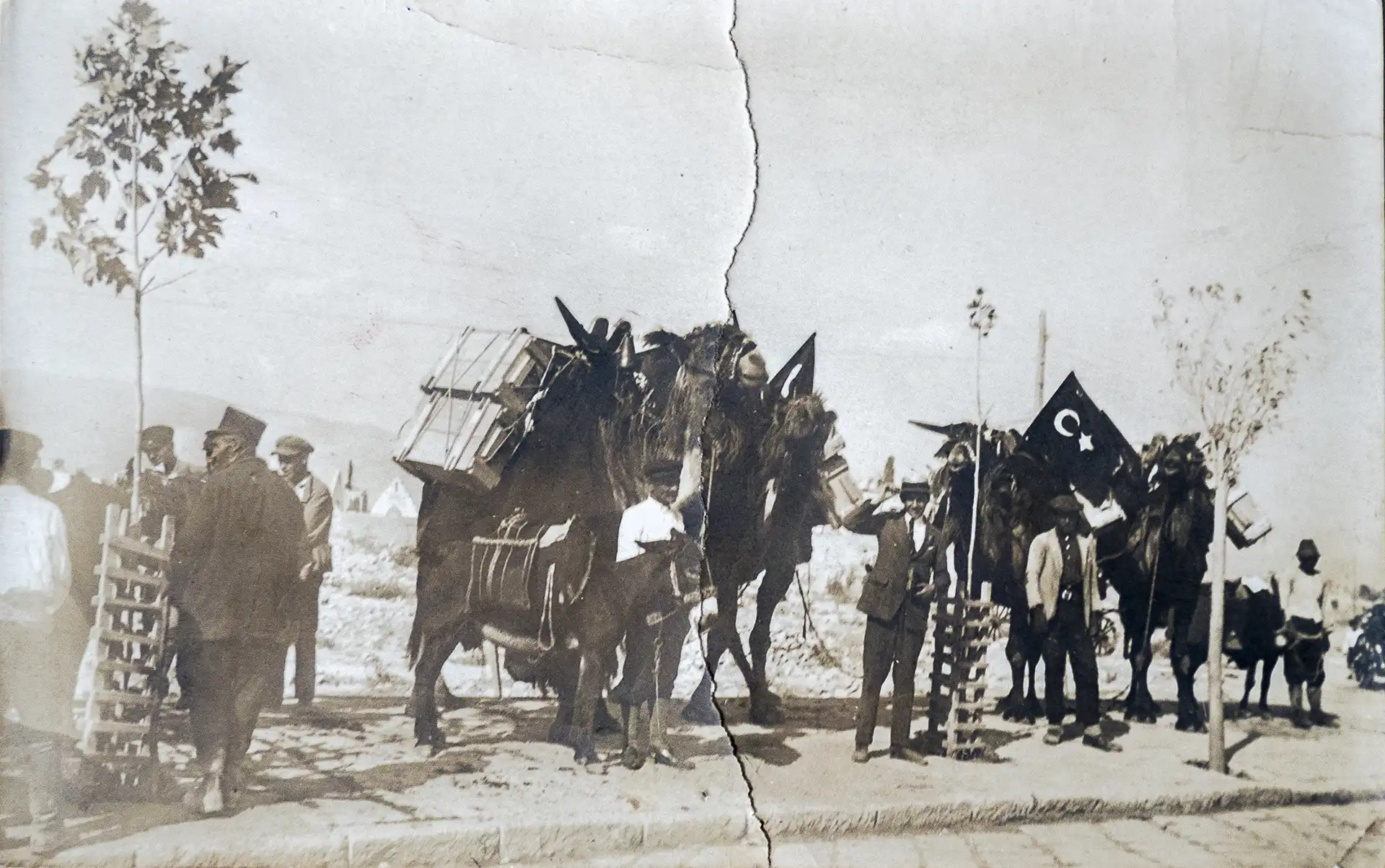 Bu fotoğraftan da anlaşıldığı gibi korteje her türlü katılama izin veriliyordu. Kim bilir nerelerden develeri ile gelip bu kutla güne katkıda bulundular. Belki bu develerin bile Kurtuluş Savaşında yük taşıma konusunda büyük katkıları olmuştur. İlginç noktalardan biri Türk Bayrağı’nın nizami olmadığıdır. İzmir’in Kurtuluş günü bir anda tüm evlerden çıkan bayraklarla gelincik tarlası gibi al bayraklarımız dalgalanmaya başlamış. Türk halkı gizliden gizliye her türlü kırmızı kumaş üzerine çarşaf gibi beyaz kumaşlardan tencere kapakları ile çizdikleri ay ve göz kararı kestikleri yıldızları dikmişler bu günü beklediklerini anlıyoruz. İşte, bu bayraklar da onlardan biri.