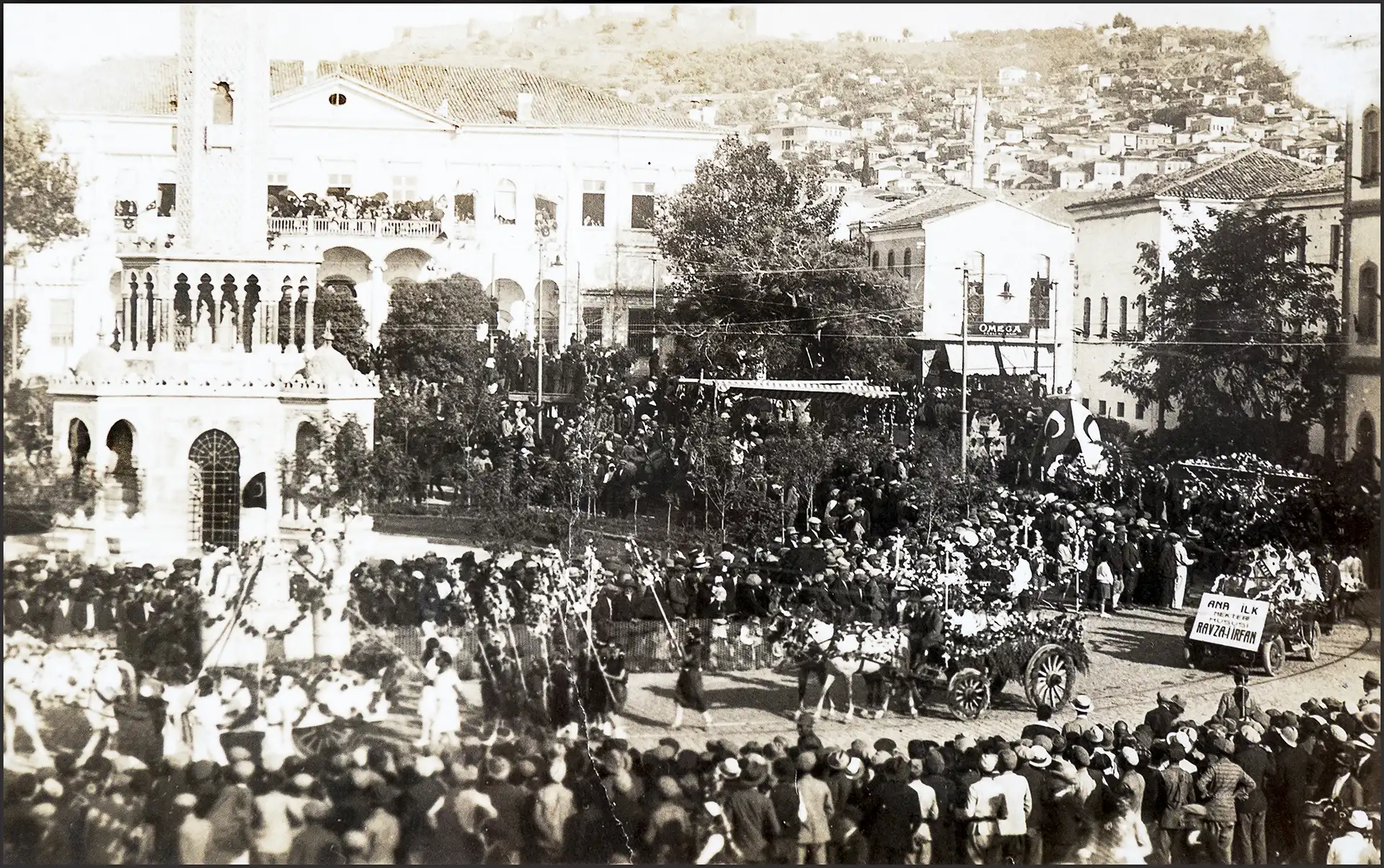 O zamanlar İzmir Kurtuluş Günü kutlamaları Konak’tan başlayıp bugün çoğu halkın Kemeraltı olarak tanımladığı Anafartalar Caddesi üzerinde kortej yapılarak Basmahane (Basmane) Garı önünde bitermiş. Ancak bu fotoğrafta bir tarih yok. Bir okulun katıldığını görüyoruz. Yeni Türkçe harfleri yer aldığına göre daha yeni bir fotoğraf; 1929 tarihli olabileceğini düşündük, diğerlerine göre. İlginç olan; Hükümet Konağı balkonunu halkın doldurduğudur. Kadifekale altında bir koruluğu algılıyoruz. Bugün orasını gecekondu dediğimiz değişimle biliyoruz. Yerde tramvay raylarını yanı sıra sağdaki binanın Sarı Kışla olduğunu seçiyoruz. Ne yazık bu güzellikleri, tarihi görselleri korumasını beceremiyoruz.