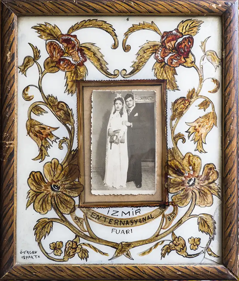 Evet, kim olduklarını bilmiyorum. Ama şunun güzelliğine bakın. 1954 yılında İzmir Enternasyonal Fuarı’nın meşhur olduğu zamanlarda çekilmiş; kıyafetlerine bakınca bunun bir nikâh töreninden olacağını düşündürüyor. Camın arkasından süsleme yapan kişi kendi imzasını (Ö. Ergin / Isparta) atmış. Sihirli gibi bir şey… Isparta’dan gelip mi burada nikâh oldu yoksa fotoğraftaki kişiler sonra mı oraya gittiler; daha sonra da İzmir bitpazarına geldi? Çantası, bilezikleri… Yani hikâye bile yazılabilir bu fotoğrafa. Hatta dikkat edilirse bir çiviye tutturmayı beceremedikleri için kâğıdın üst tarafında küçük bir delik açılmış. Belki bir köy evin duvarındaydı. Çocukları İzmir’e taşınınca sonraki nesil bunu anlamsız bularak gözden çıkarmıştı.