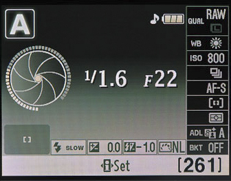 Ardından Diyafram Değeri f/22 olarak değiştirilmiş, ISO 800 olarak yine sabit, bu durumda kamera ortam ışığını ölçüp Perde Hızı’nı 1/1.6sn olarak belirlemiş.