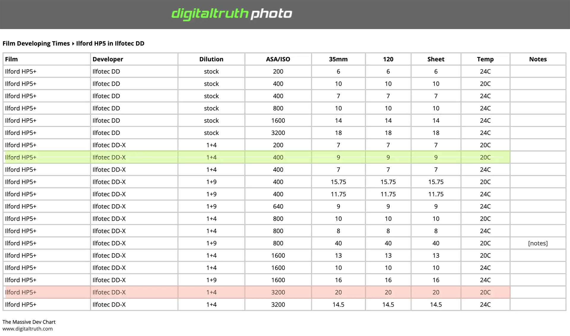 Kullandığım filmlere göre banyo sürelerini kontrol ettiğim bir referans sitem var; digitaltruth. Bu siteye göre ILFORD HP5+ için banyo süreleri aşağıdaki gibidir:
