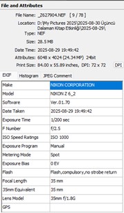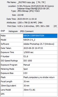 Renk sıcaklığını PS 5150 K veriyor. Flaş sağ tarafta yukarında aşağıya yaklaşık 45 derece açıyla kayın biraderim tarafında tutuluyor. S:1/800, F:1.8, 35 mm, spot ölçüm. Çekim saati 19.56, daha hava kararmış değil.