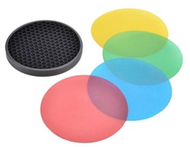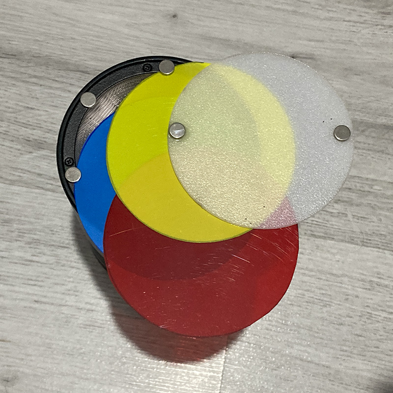 Yeni nesil ürünlerde ışık kırıcı filtrelerin magnetle tutturulması yaygın hale geldi. Fotoğrafçıya büyük kolaylık. Ancak satın almaya kalktığınızda marka bedelini de ödemek (AD100 Pro için bu set (AK-R1 diye geçiyor ve yuvarlak kafa flaşlarıyla aynı. Fiyatı yanılmıyorsam 2,799 TL arasında) durumundasınız. Bunun yerine internetten 5 mm çapında neodyum magnet alabilirsiniz; 20 adet 99 TL. Kırtasiyeciden de A4 boyutunda renkli şeffaf plastik var. Tanesi 5 TL. bir tanesinden altı adet 70 mm çapında dairesel kesim yapabiliyorsunuz. Nasıl kullanıldığını yandaki fotoğraf anlatıyor. Beyaz difüzör LED aydınlatmalarda kullanılan