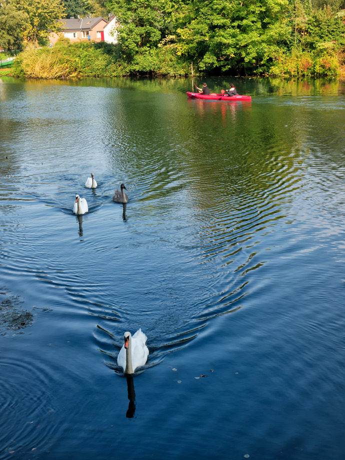 Gölün tüm çevresinde yüksekçe bir yerden geçen yürüme yolu mevcuttu ve gölün hemen bitiminden başlayan sık ve yüksek ağaçlar yoldan göl kenarının net görünmesini engelliyordu. Yukarıdaki yol kenarında bulunan diğer fotoğraf severler, ağaç dallarının arasından kuğuları fotoğraflamak için birbirleriyle yarışırken, ben gölün kenarında, dibimdeki kuğularla ve ördeklerle çoktan arkadaş olmuştum.
