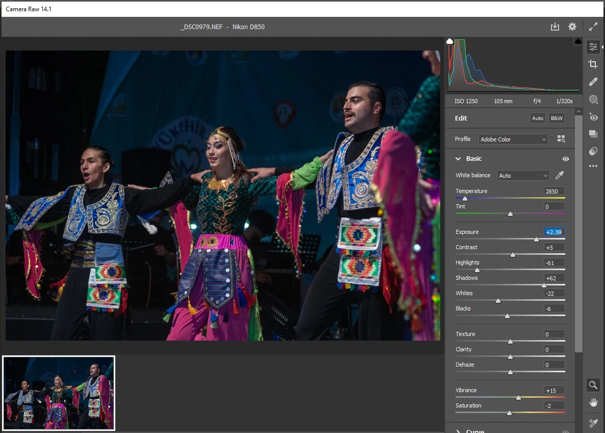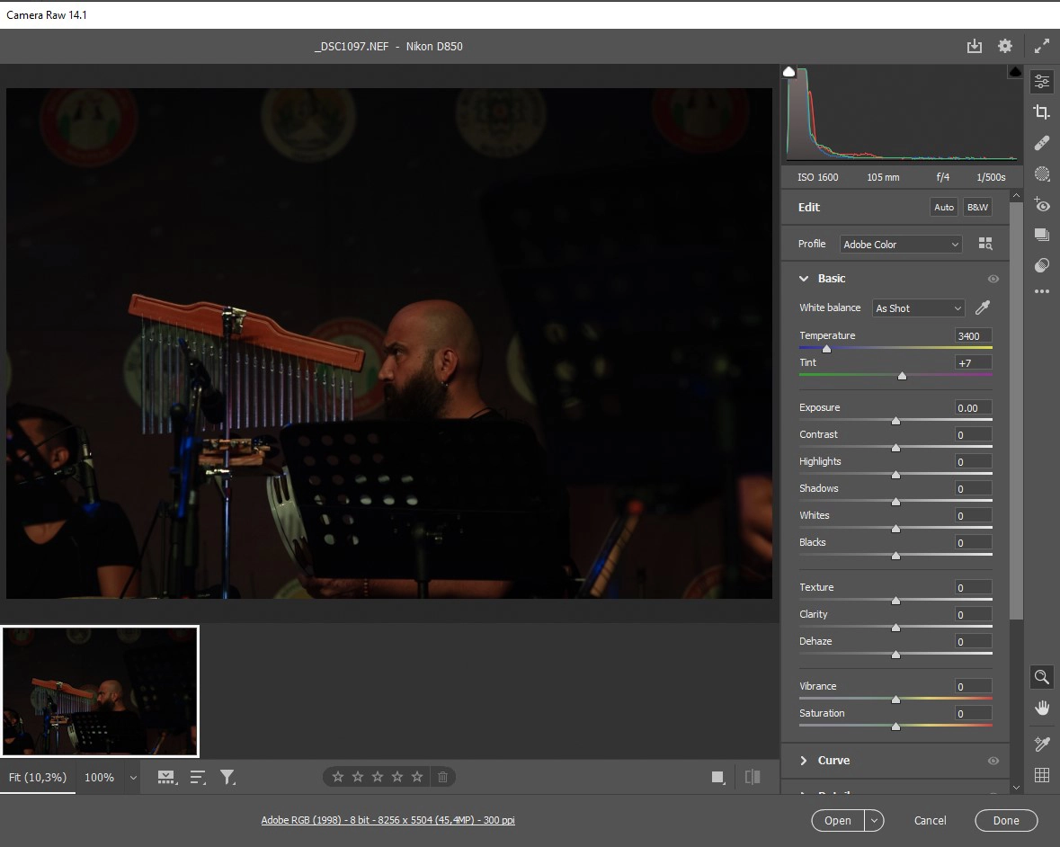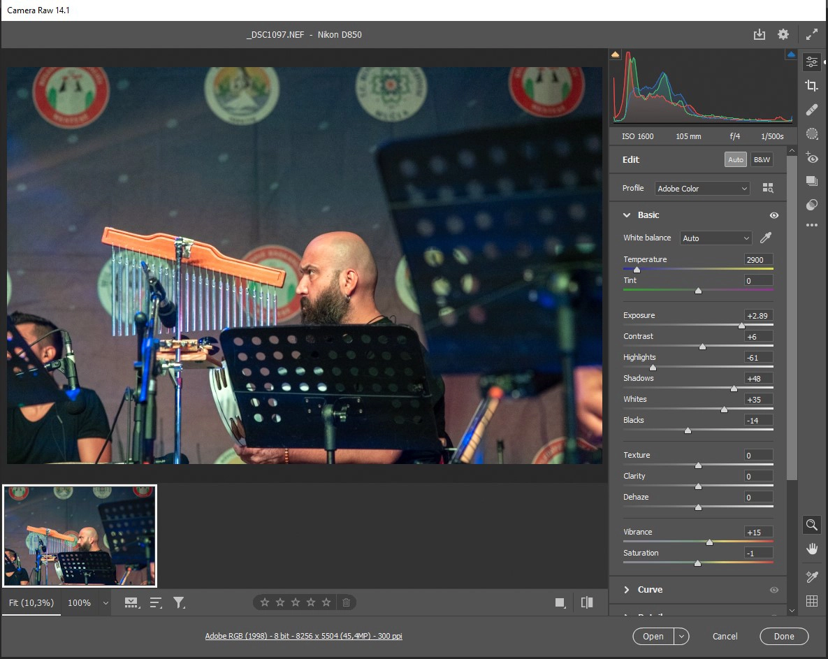 Ancak mistik bir atmosfer için sahnede ışık giderek azaltıldı. Bu orkestranın elemanları üzerindeki ışığın da azalmasına neden oldu. Bu koşullarda çektiğim bir fotoğrafın “RAW” halini vereyim: