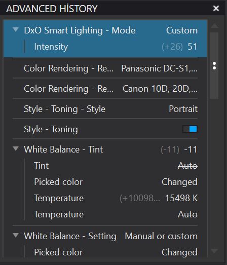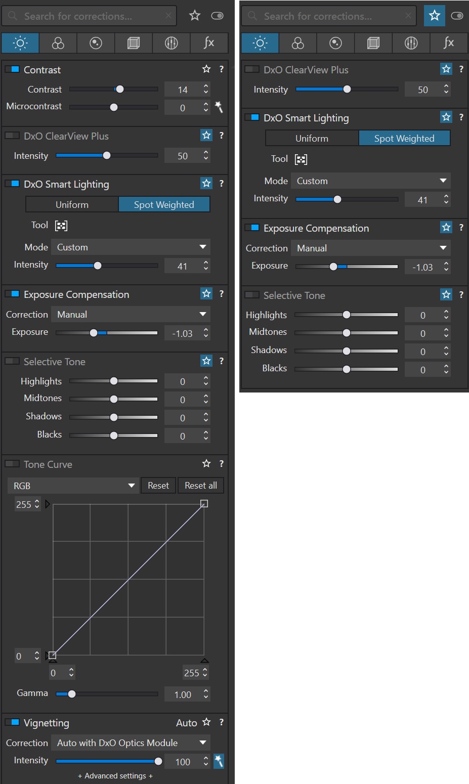 DxO Photolab’da açık ayarlar mavi ile gösteriliyor (sağda), Lightroom’da gri-siyah (solda). Çok basit bir detay ama anında açık ayarları görebiliyorsunuz.
