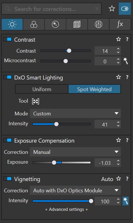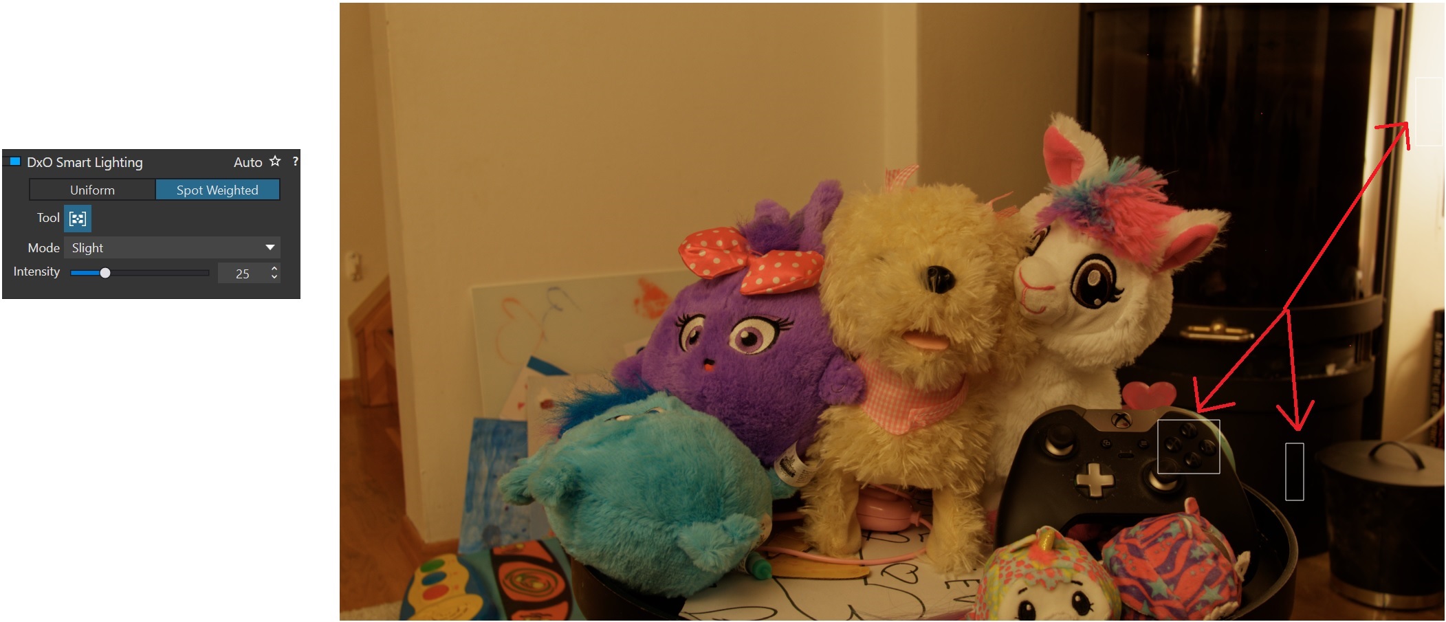 “Spot Weighted” sekmesi de böyle çalışıyor. Fotoğrafta aşırı parlak bölgeler veya çok derin gölgeler varsa, oraları işaretleyince DxO fotoğrafın kontrastı ve ışığını o bölgelerde detaylar geri gelecek şekilde ayarlıyor. Bu bölgesel düzeltme değil, dikkatinizi çekerim. Tüm fotoğrafın ayarları değişiyor. Bu yüzden buna “Spot Weighted” demişler.
