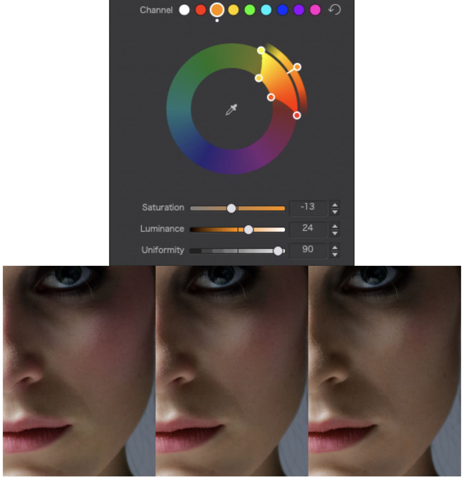 Seçilen renk ten rengi. En soldakinde “uniformity” ayarı en düşük, en sağdakinde en yüksek. Gördüğünüz gibi, bu ayar en yukarıdayken araya başka renk giremiyor, en düşükken de diğer renkler fazlaca giriyor. Gökyüzü veya ten rengi gibi renklerde bayağı işe yarayan bir ayar.
