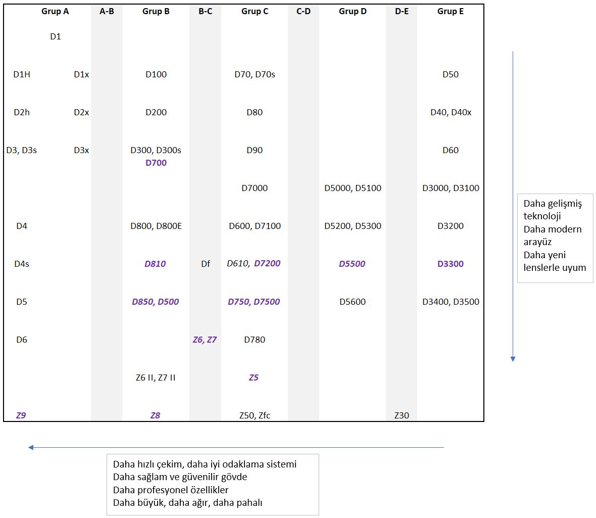 Gövdeleri A’dan E’ye grupladım. Arada “B-C” gibi karışık gövdeler de var (yani hem B hem C ile ortak yanları olan gövdeler). Bazı gövdeleri sınıflandırmada zorlandım (örneğin D700, Z50) ama genel olarak yukarıdaki şekil gerçeği yansıtıyor diye düşünüyorum.