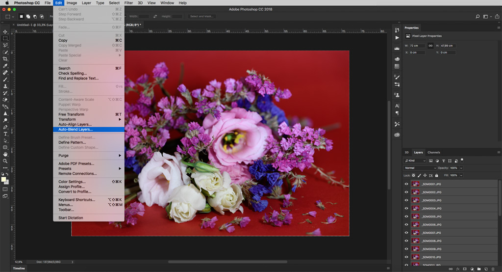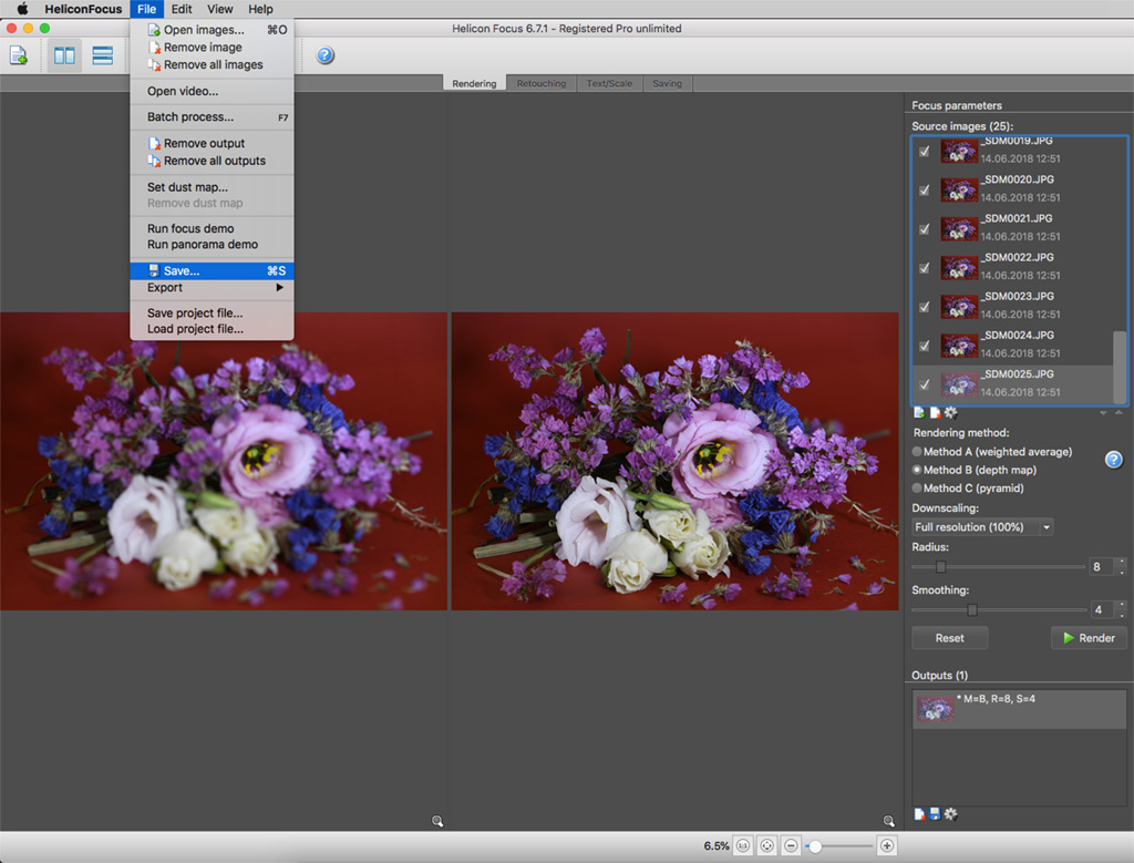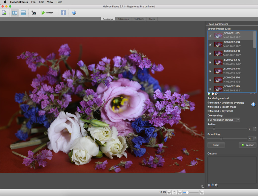 Ardından farklı odak uzaklıklarında çektiğiniz fotoğrafları bilgisayarınıza kopyalarsınız ve tümünü tek bir görüntüde birleştirmek için bir üçüncü parti odak istifleme / birleştirme yazılımı kullanırsınız.