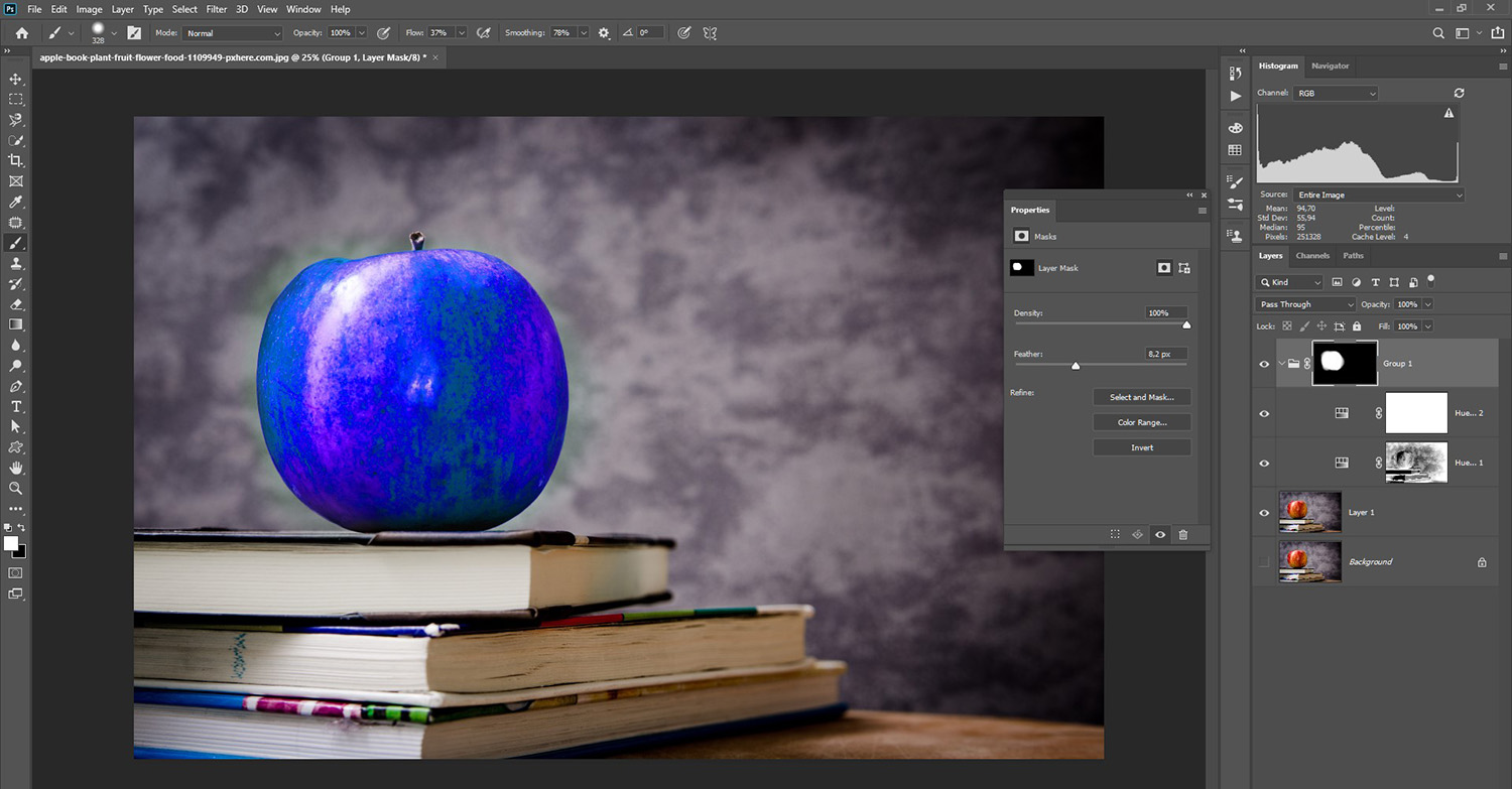 Çalışma konusu: “Level 1” maskını seçip “Window>Properties” den “Density” ile maskın yoğunluğunu ayarlayıp boyama işleminin etkisini değiştirebilirsiniz. Lütfen deneyin.