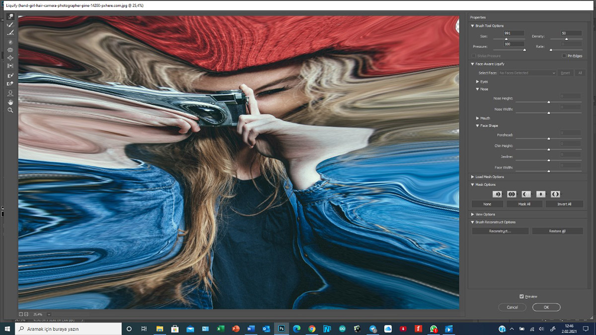 Şimdi “Efekt” layerı üzerinde “Filter> Liqufy> Forward Wrap Tool” ile modeli çekiştirelim 😊. Bunu niye yapıyoruz? Daha sonra uygulayacağımız buzun kristalize halinin altında modelin kıyafet renklerinin yansıma gibi görünmesi için. İşte bu fotoğrafa fantezi katmanın başlangıcı olacaktır.