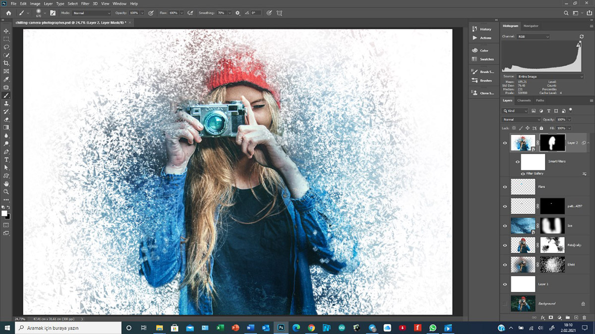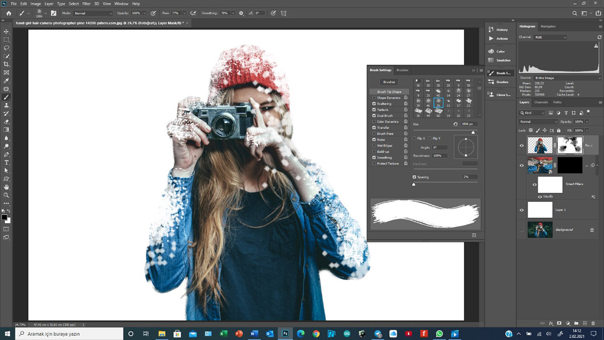 Şimdi iş -bana göre- zor kısma geldi. Zor, çünkü burada buz kristallerinin şekline, büyüklüğüne karar verip “Fotoğrafçı” layerının “Mask” ına (Foreground=Siyah olmasına dikkat ediniz) uygulayacağız. Seçimimizin bir düzen ve tekrar eden biçimde olmaması gerekir. Dolayısıyla birden fazla “Brush” tipi seçip değişik boyutlarda uygulamak gerekecek. Bu da ancak ilk uygulamada deneme yanılma yöntemiyle olacak. Bu uygulamayı değişik kompozisyonlar üzerinde tekrar ettikçe daha doğru seçimler yapılacağı aşikardır.
