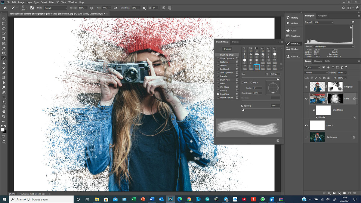 Bu noktada çerçevenin kenarlarına kadar yaptığım saçılma bana fazla geldi. “Efekt” layerına giderek “Erase” ve “Brush” işlemleriyle “Flow” ayarı yaparak yeniden düzenleme yaptım.