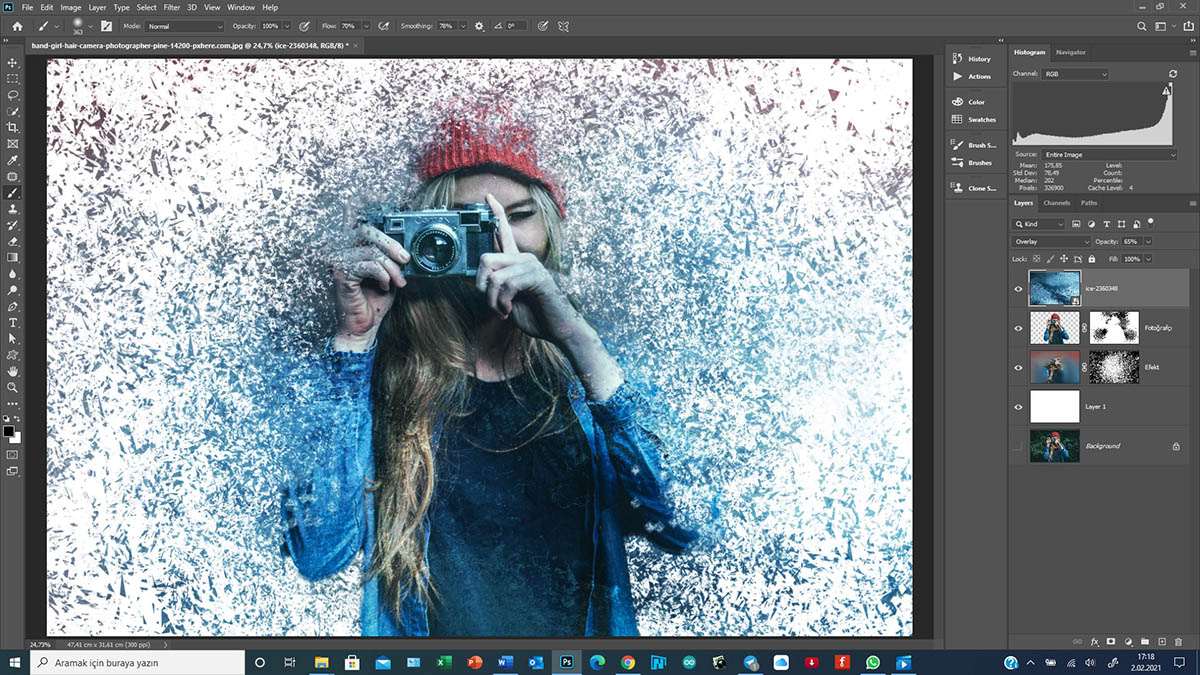 Şimdi sırada buz görüntüsünü biraz daha fantezi ekleyelim. Bunun için şu fotoğrafı kullanalım. Bunu çalışmamıza yeni bir layer olarak ekleyip “Overlay” yapalım. “Opacity” ayarını muhakkak değiştirerek ortaya çıkan sonucu değerlendiriniz.