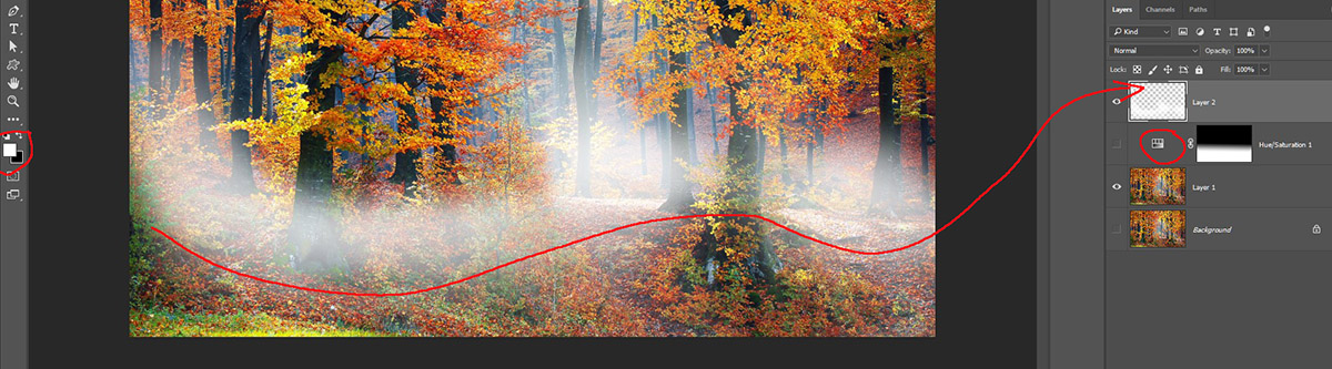 Uygulamalarda üzerinde çalıştığımız layerları “Disable/Enable” yaparak farklı görüntüler elde edebiliriz. Burada “Hue/Saturation 1” layerına bunu uyguladığımızda farklı sis efekti ortaya çıkmaktadır.