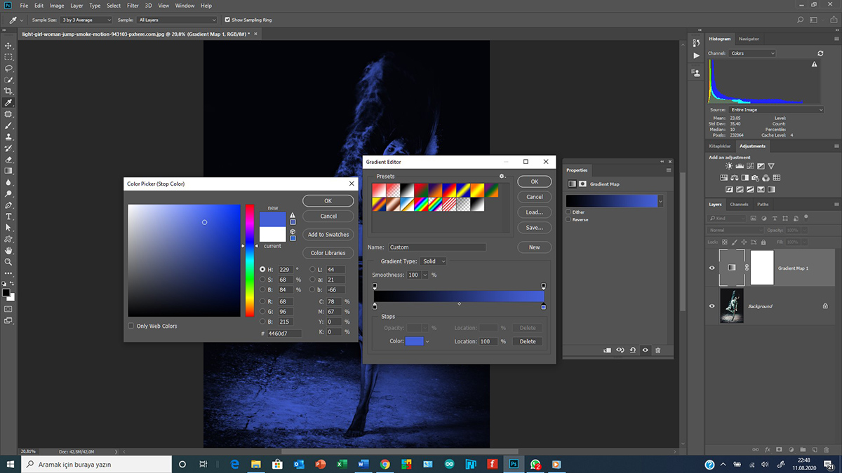 2. Eğer renkleri beğenmezseniz istediğiniz bir anda “Gradienet Map” in küçük kutusuna çift tıklayıp 4 ncü maddede yaptığımız işleme geri dönebiliriz. Burada yaptığımız her değişiklik fotoğrafa otomatik uygulanacaktır.