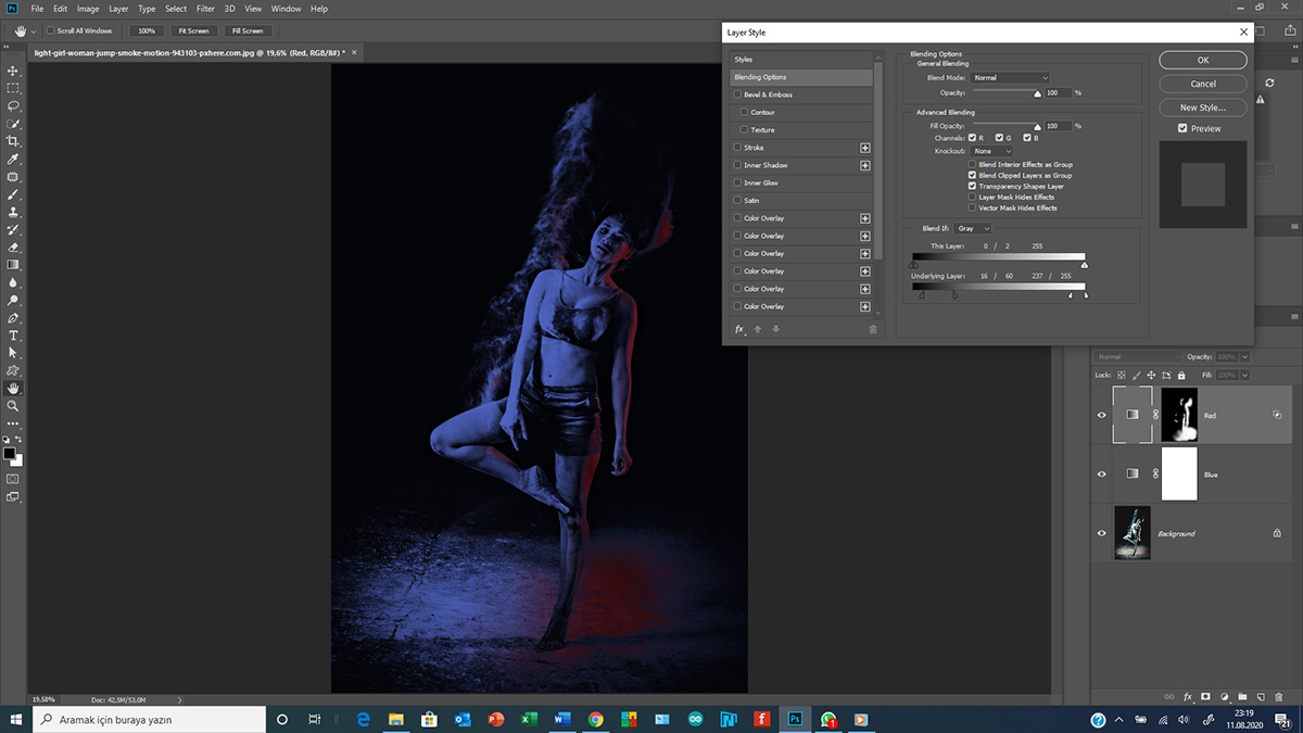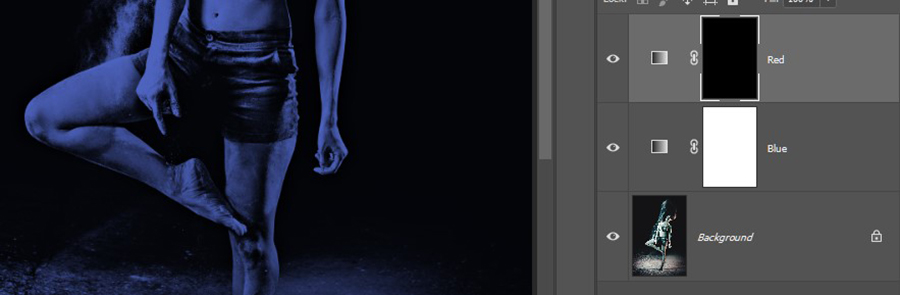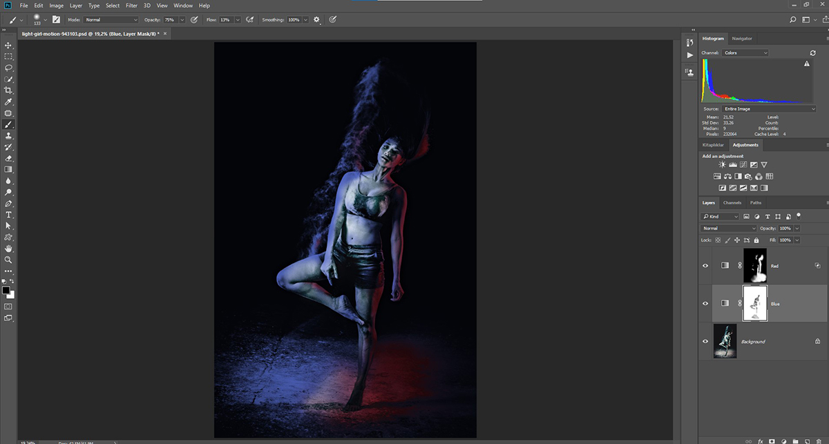 1. Şimdi “ben karşıdan beyaz ışık flaş da kullanıyordum 😊” diyorsanız “Blue” layer maskında benzer boyama işlemi yaparak dansçının objektif yönünü ilk renklerine alabiliriz. Denemek için yapalım mı?