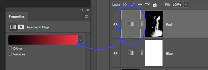1. Ve şimdi mavi ve kırmızı renklerin girişimini yapacağız. Bunun için adını ”Red” olarak (Layer adını değiştirmek için default olarak gelen adın üstüne çift tıklayın. Adın yazılı olduğu alan aktif olacaktır. Yeni adı yazın) değiştirdiğim “Gradient Map” in “Mask” ını “Invert” etmemiz gerekecek. Yapacağımız işlem, bu mask seçili iken “Ctrl+I” yapmak.