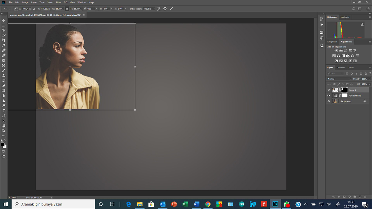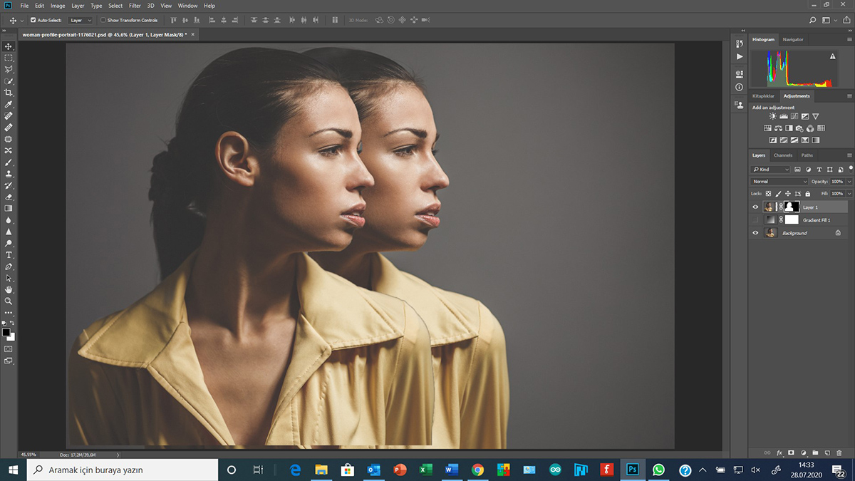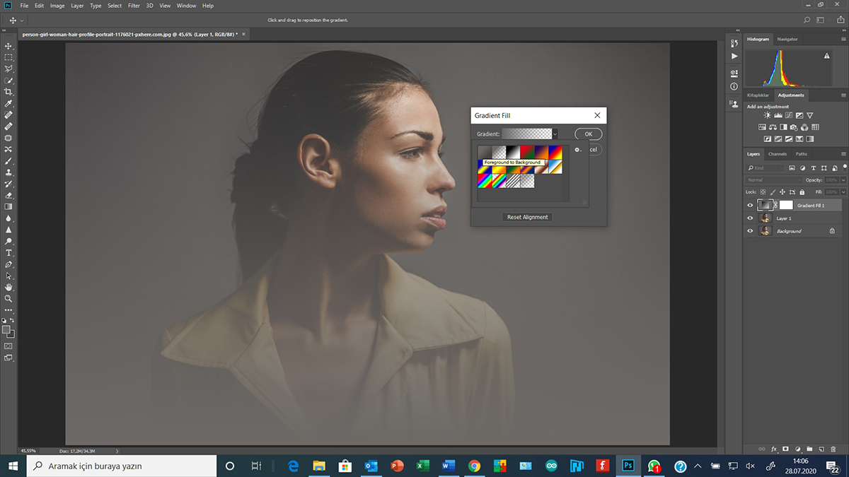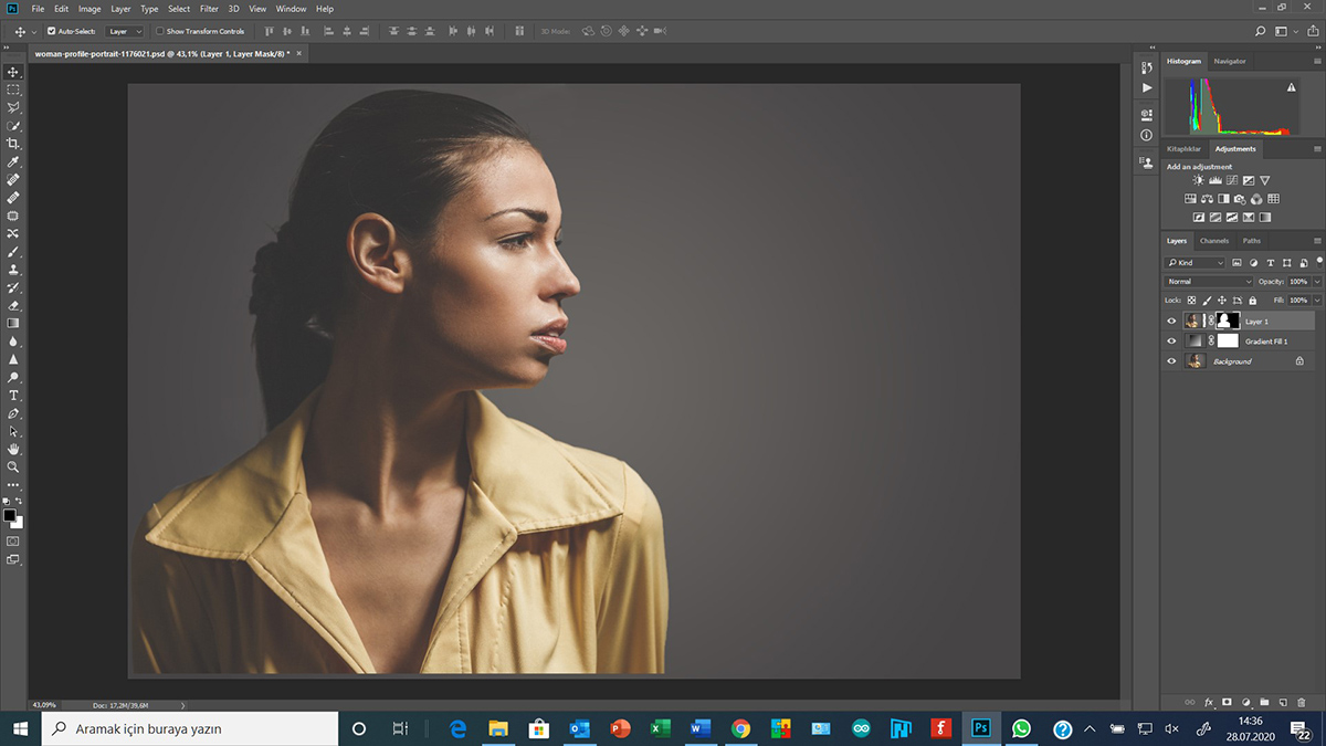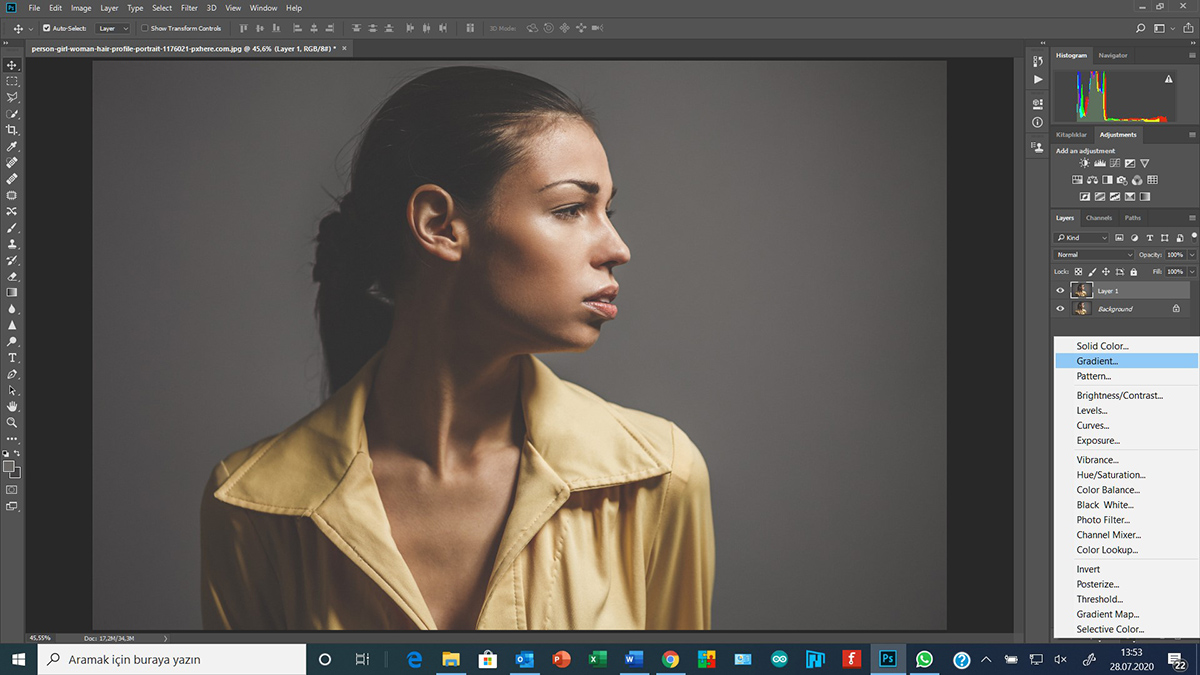 Her zamanki gibi asıl fotoğrafı açalım. Modeli bize göre sola doğru çekmemiz gerekiyor. Ancak bunu yaparken arka planın bozulmaması gerek. Bunu “Adjustment Layer” da yer alan “Gradient” ile yapacağız. “Gradient” kullanmamızın nedeni orijinal fotoğrafın arka fonu “Radial Gradient”.