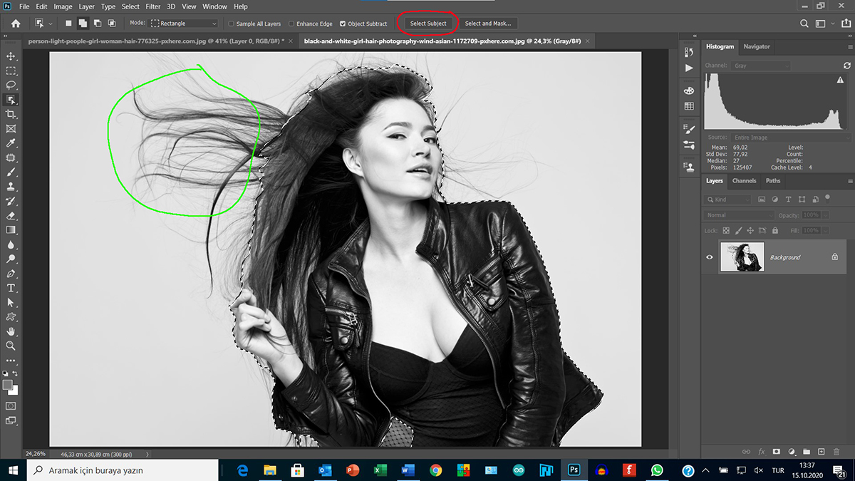 Fotoğraf sizi korkuttu mu? Beni de… Bu fotoğrafı kullandığımızda CC2020 yeni özellik olan “Select Subject” tek başına işe yaramayacaktır. Yukarıda bahsettiğim beş özellik olmasına rağmen gerçekten saçları seçimi için çok ama çok zor bir fotoğraf.