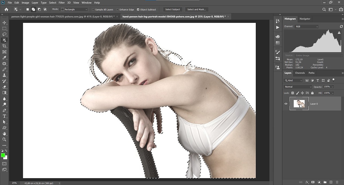 Eğer bu fotoğrafta “Select> Color Range> Highlights” kullanırsam mükemmele yakın bir seçim gerçekleşiyor. Tabii “Highlights” ile arka planı seçtiğimi vurgulamalıyım. Ancak yüz, boyun ve el de seçildiği için bunları “Quick Selection” veya “Lasso Tool” ile ya da başka bir seçim aracı ile seçim dışı bırakmam gerekecek. Saçlara dikkat kesildiğimiz için bunu yapmayacağım.